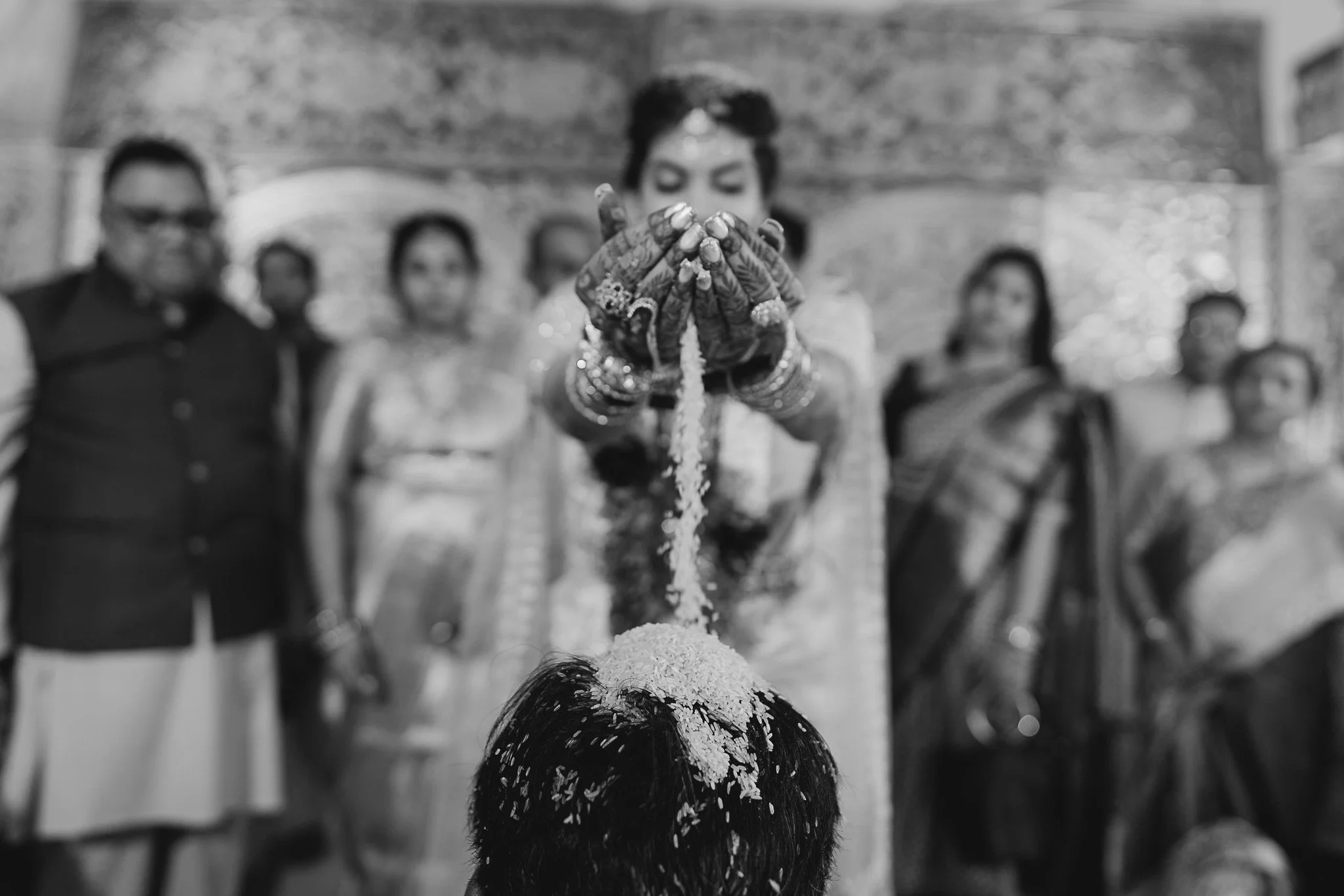 Rituals are layered with movement, symbolism, and emotion. In this shot, the falling rice appears almost poetic—frozen mid-air. Black and white exaggerates the contrast, making the grains shimmer against the darker background.